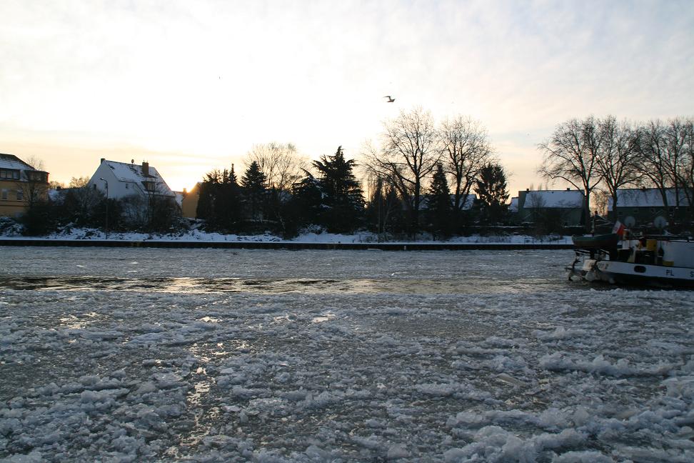 Sonntag, 11.01.2009Die kalten Nächte hatten angehalten. Wir hatten inzwischen seit 160 Stunden Dauerfrost, die Nachttemperaturen sanken weiterhin bis auf -12°C. Tagsüber stieg die Temperatur selten über -3°C hinaus. So war ich auch kaum überrascht, als ich den Kanal dann mit fast völliger Eisbedeckung mit einer Eisdicke bis 10cm vorfand. Es war natürlich keine vollständig zusammenhängende Eisdecke, denn die Schiffe schoben die Eismassen immer wieder in sich zusammen und verursachten einige Spannungen.